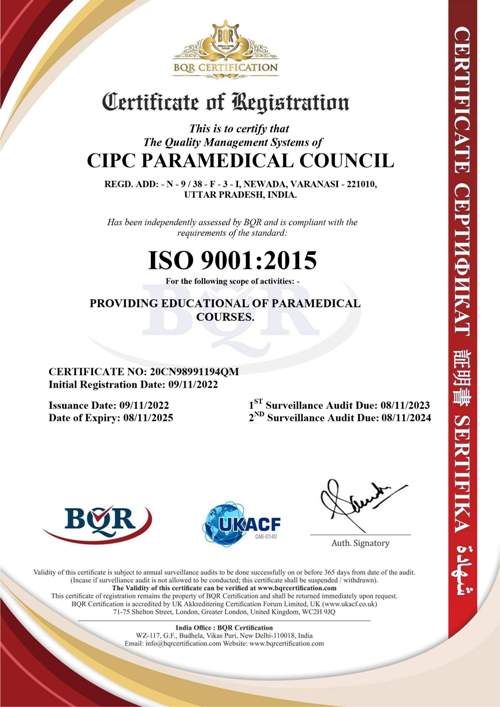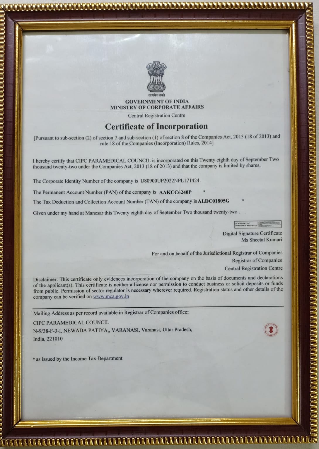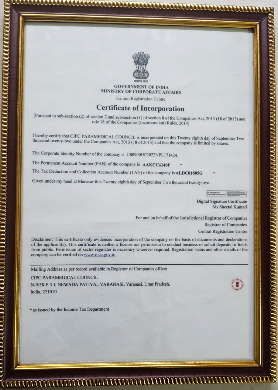 WELCOME TO CIPC PARAMEDICAL COUNCIL. CIPC PARAMEDICAL COUNCIL IS REGISTERED UNDER THE COMPANIES ACT 2013. IT'S REGISTERED FOR PRE DEFINED OBJECTS OR ACTIVITY EDUCATION. AS PER ACTIVITY CODE MENTIONED UNDER COMPANY C/N NUMBER U80900UP2022NP171424 ITIS SET UP DIRECTLY BY REGISTERING. THE COMPANY WITH ROC,MINISTRY OF CORPORATE AFFAIRS. IT'S REGISTERED OFFICE ADDRESS IS N9/38 F-31 NEWADA PATIYA VARANASI -UP-221010 REGISTERED IN 2022-09-28.IN INDIA-UP To view our ISO registration Certificate click here.